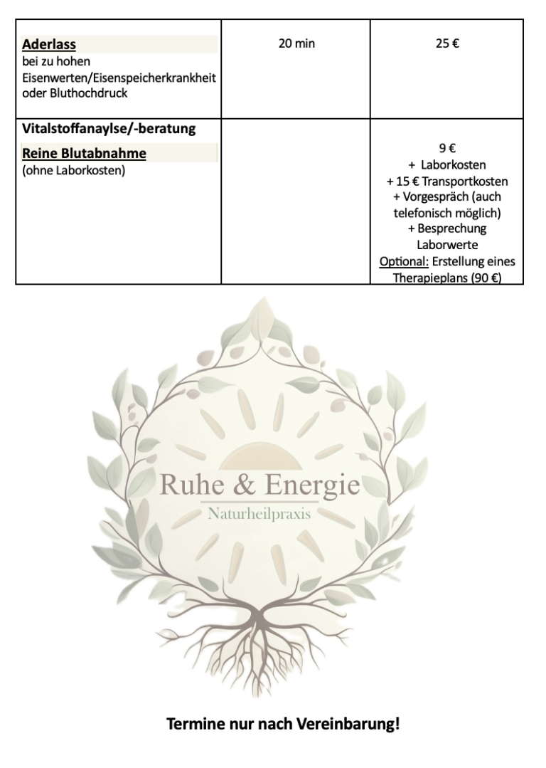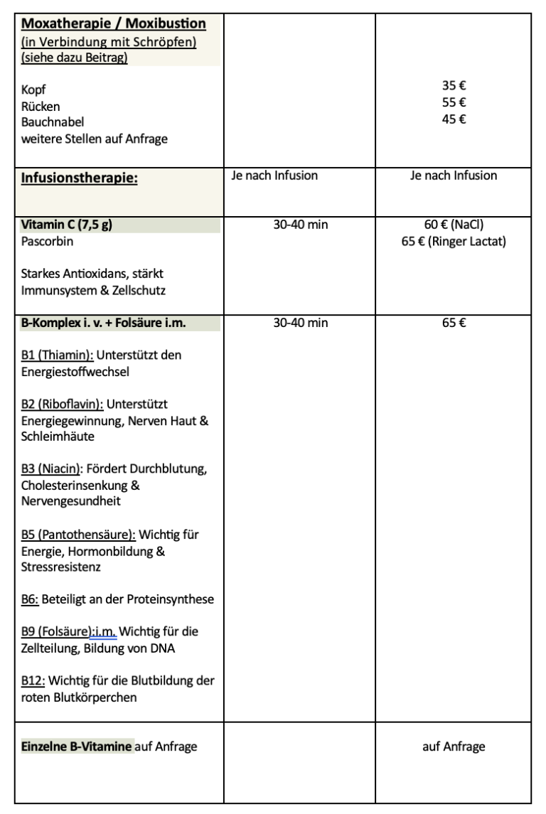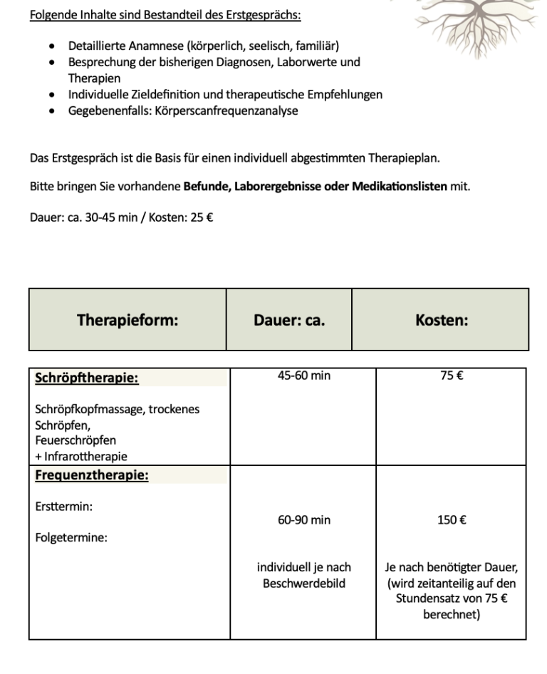 Die Behandlungskosten richten sich nach Art, Dauer und therapeutschem Aufwand der jeweiligen Sitzung. Vor Beginn einer Therapie findet grundsätzlich ein persönliches Erstgespräch statt, in dem wir gemeinsam das passende Behandlungskonzept besprechen. In meiner Praxis werden Therapieverfahren häufig individuell kombiniert, um ein ganzheitliches und sinnvolles Behandlungskonzept zu ermöglichen.